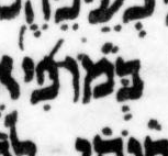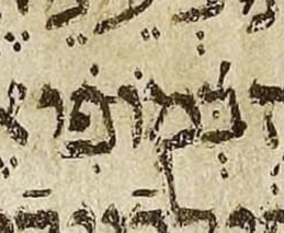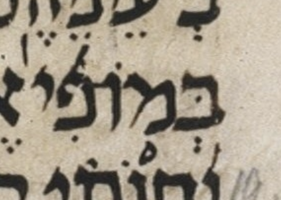 Here μY matches μL, with the exception of two dots roughly between the ב and the מ. These dots are of unequal size, which is odd. They are likely a Masorah parva “callout”—note that instead of a masorah circle, μY uses a pair of above-dots as a “callout” for a Masorah parva note. See 22:21 for another example of this two-dot callout notation.