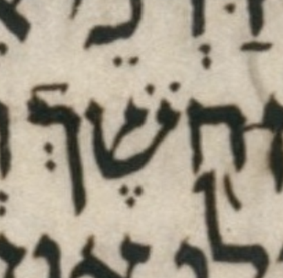 In μY, the mark we would charitably interpret as דחי appears more or less centered on the ח and touches (collides with) an encroaching ל ascender. Possibly this ascender prevented the דחי from assuming its expected prepositive position. And possibly the preceding final נ contributed to the crowding that forced the דחי forward. And/or possibly the prepositive position of דחי, though viewed as a goal by the naqdan of μY, was not such a high priority as we would view it as today. — U — M — μL (page 407A, col 1, line 3):