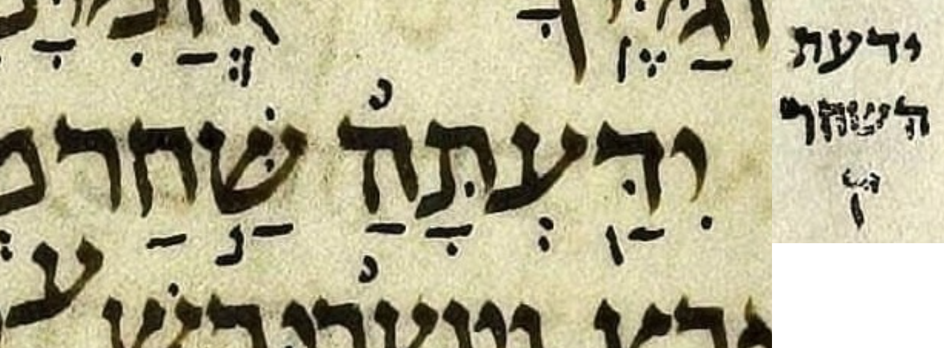 Aside: the Jerusalem Crown edition, despite normally staying quite close to μA, found μA’s pointing of the כתיב to be too confusing for its body text, relegating it to an appendix. The question is where on the כתיב letters should we put the פתח that implicitly belongs to the ה of השחר. Both μA and μL put this פתח on the ה of ידעתה. In its body text, the Jerusalem Crown edition puts the פתח on no letter: instead, it floats before the ש of שחר. A vowel mark floating like this before a כתיב word has manuscript precedent. I.e. although the Jerusalem Crown edition is diverging from the manuscript here, it is not divering from manuscript tradition in general by using this notation.